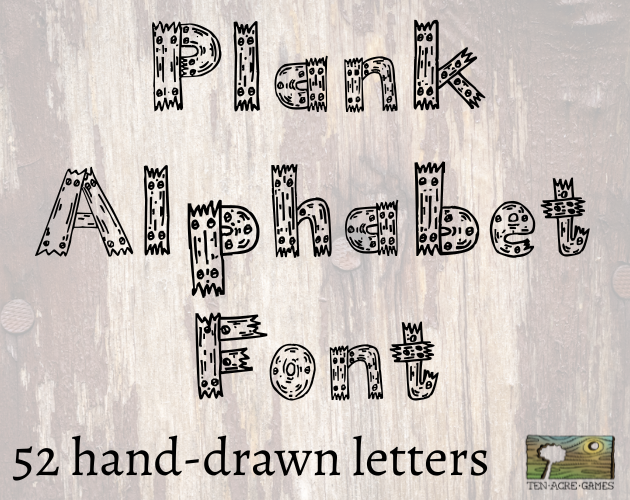 Plank Alphabet is illustrated by Catherine Lashbrooke and distributed by Ten Acre Games. The font is licensed under the Creative Commons No Rights Reserved licence (CC0) - you may use this font in any way you like without attribution, although acknowledging Ten Acre Games would be greatly appreciated.